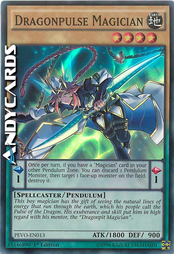 This boy magician has the gift of seeing the natural lines of energy that run through the earth, which his people call the Pulse of the Dragon. His exuberance and skill put him in high regard with his mentor, the "Dragonpit Magician". - Once per turn, if you have a "Magician" card in your other Pendulum Zone: You can discard 1 Pendulum Monster, then target 1 face-up monster on the field; destroy it.