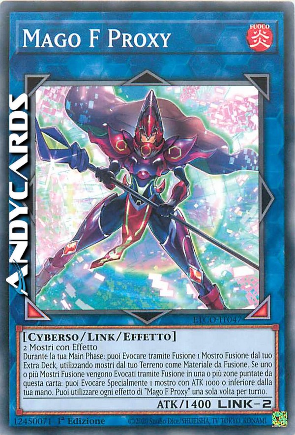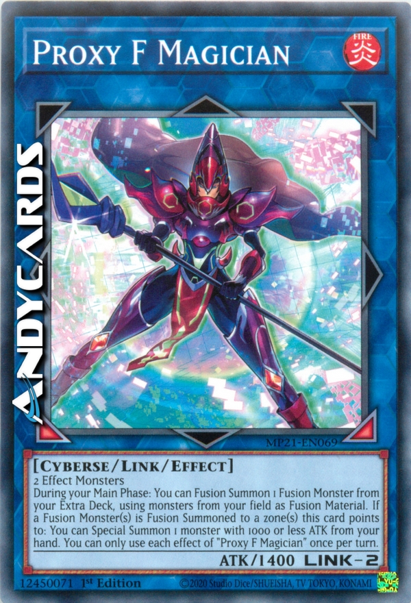 Durante la tua Main Phase: puoi Evocare tramite Fusione 1 Mostro Fusione dal tuo Extra Deck, utilizzando mostri dal tuo Terreno come Materiale da Fusione. Se uno o più Mostri Fusione vengono Evocati tramite Fusione in una o più zone puntate da questa carta: puoi Evocare Specialmente 1 mostro con ATK 1000 o inferiore dalla tua mano. Puoi utilizzare ogni effetto di "Mago F Proxy" una sola volta per turno.