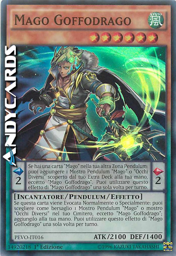 Se questa carta viene Evocata Normalmente o Specialmente: puoi scegliere come bersaglio 1 Mostro Pendulum "Mago" o mostro "Occhi Diversi" nel tuo Cimitero, eccetto "Mago Goffodrago"; aggiungilo alla tua mano. Puoi utilizzare questo effetto di "Mago Goffodrago" una sola volta per turno. - Se hai una carta "Mago" nella tua altra Zona Pendulum: puoi aggiungere 1 Mostro Pendulum "Mago" o "Occhi Diversi" scoperto dal tuo Extra Deck alla tua mano, eccetto "Mago Goffodrago". Puoi utilizzare questo effetto di "Mago Goffodrago" una sola volta per turno.