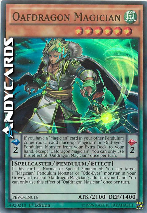 If this card is Normal or Special Summoned: You can target 1 "Magician" Pendulum Monster or 1 "Odd-Eyes" monster in your Graveyard, except "Oafdragon Magician"; add it to your hand. You can only use this effect of "Oafdragon Magician" once per turn. - If you have a "Magician" card in your other Pendulum Zone: You can add 1 face-up "Magician" or "Odd-Eyes" Pendulum Monster from your Extra Deck to your hand, except "Oafdragon Magician". You can only use this effect of "Oafdragon Magician" once per turn.