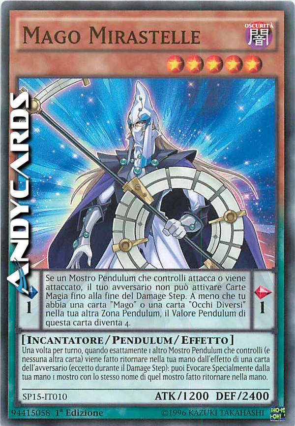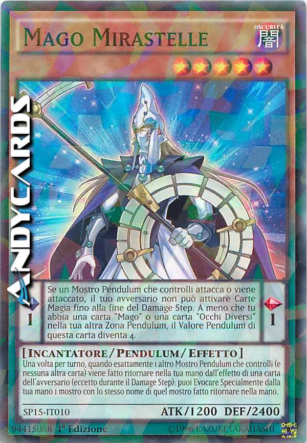 Una volta per turno, quando esattamente 1 altro Mostro Pendulum che controlli (e nessuna altra carta) viene fatto ritornare nella tua mano dall'effetto di una carta dell'avversario (eccetto durante il Damage Step): puoi Evocare Specialmente dalla tua mano 1 mostro con lo stesso nome di quel mostro fatto ritornare nella mano. - Se un Mostro Pendulum che controlli combatte, il tuo avversario non può attivare Carte Magia fino alla fine del Damage Step. A meno che tu abbia una carta "Mago" o una carta "Occhi Diversi" nella tua altra Zona Pendulum, il Valore Pendulum di questa carta diventa 4.