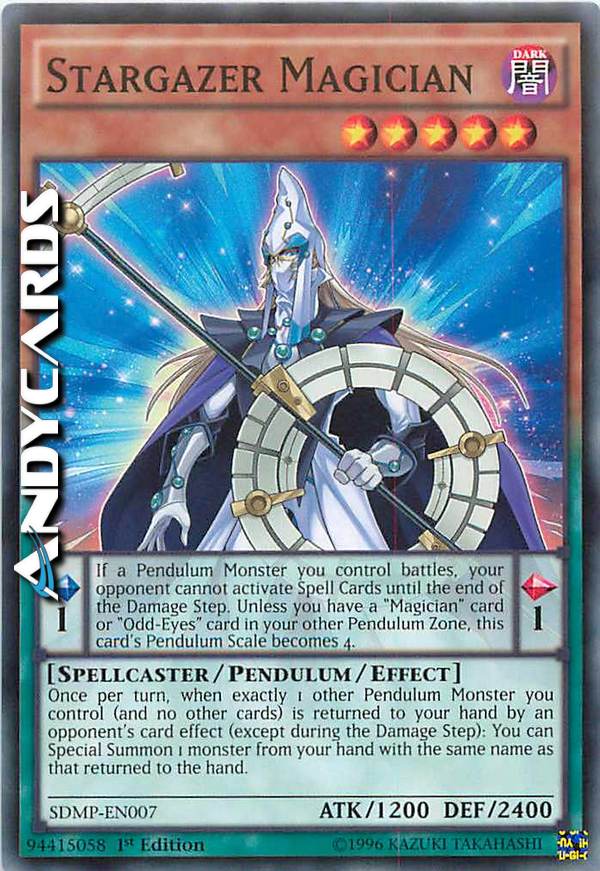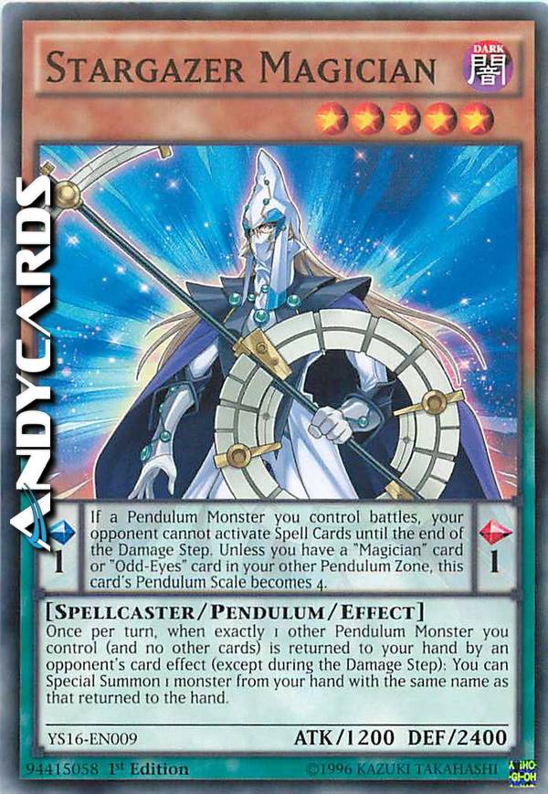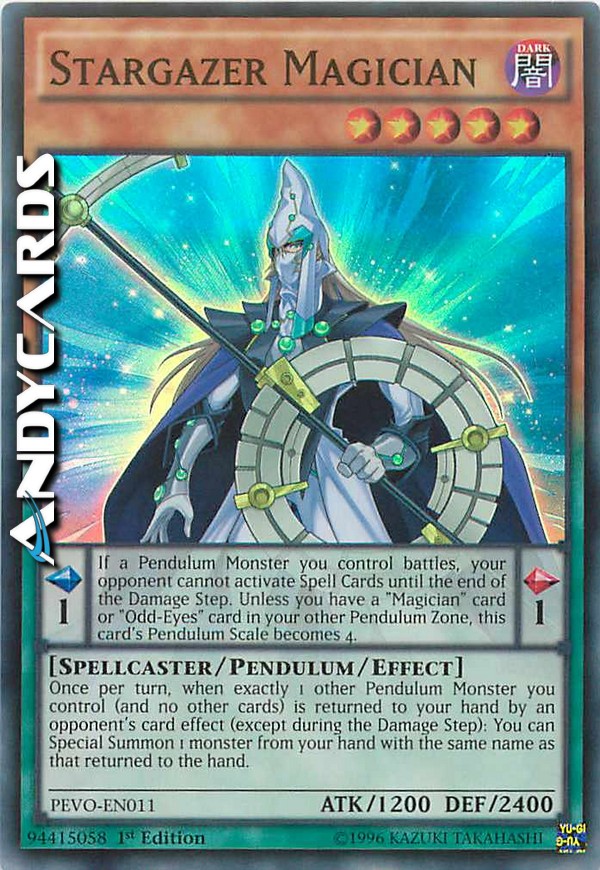 Pendulum Effect: If a Pendulum Monster you control attacks or is attacked, your opponent cannot activate Spell Cards until the end of the Damage Step. Unless you have a "Magician" card or "Odd-Eyes" card in your other Pendulum Zone, this card's Pendulum Scale becomes 4