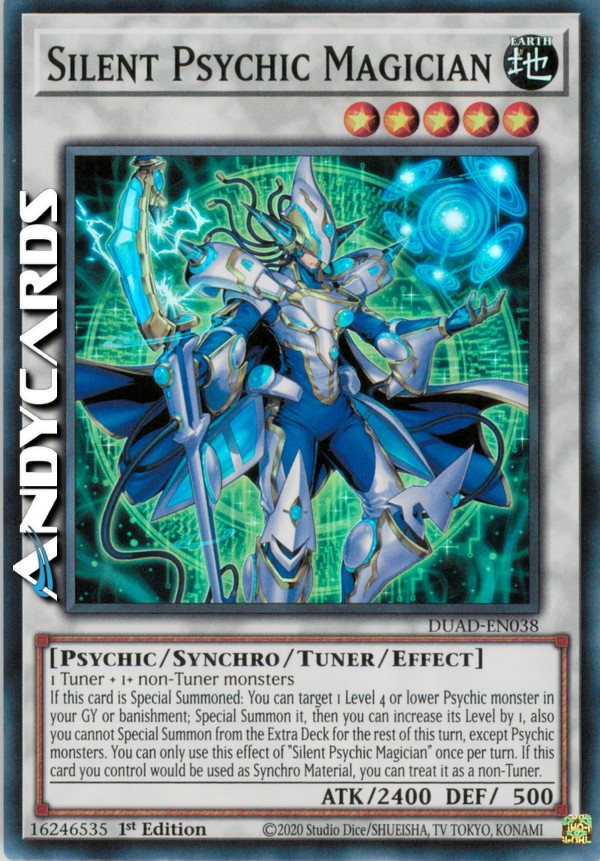 Se questa carta viene Evocata Specialmente: puoi scegliere come bersaglio 1 mostro Psichico di Livello 4 o inferiore nel tuo Cimitero o carte bandite; Evocalo Specialmente, poi puoi aumentare il suo Livello di 1, inoltre non puoi Evocare Specialmente dall'Extra Deck per il resto di questo turno, eccetto mostri Psichico. Puoi utilizzare questo effetto di "Mago Psichico Silente" una sola volta per turno. Se questa carta che controlli sta per essere utilizzata come Materiale Synchro, puoi considerarla come un non-Tuner.