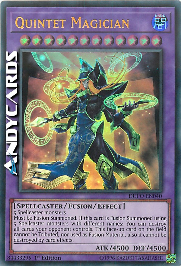 Must be Fusion Summoned. If this card is Fusion Summoned using 5 Spellcaster monsters with different names: You can destroy all cards your opponent controls. This face-up card on the field cannot be Tributed, nor used as Fusion Material, also it cannot be destroyed by card effects.