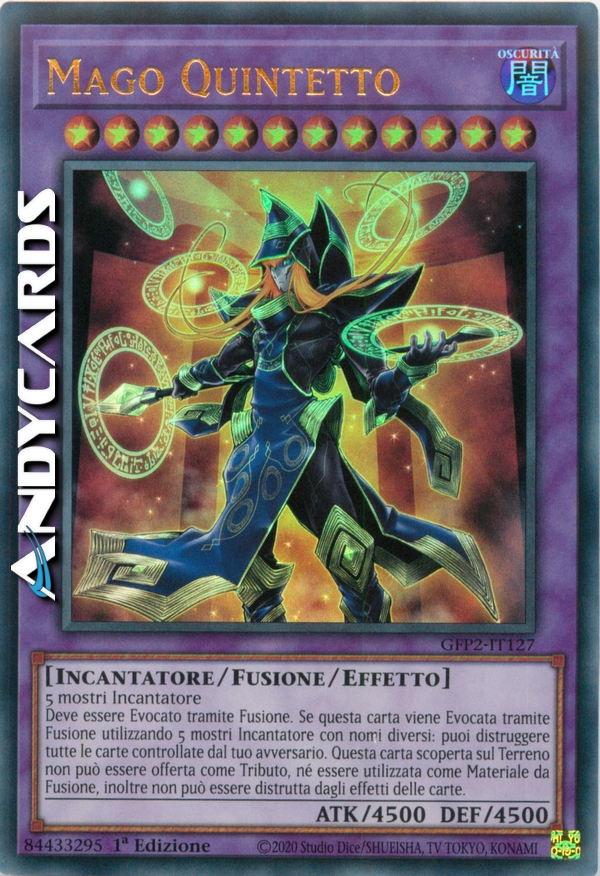 Deve essere Evocato tramite Fusione. Se questa carta viene Evocata tramite Fusione utilizzando 5 mostri Incantatore con nomi diversi: puoi distruggere tutte le carte controllate dal tuo avversario. Questa carta scoperta sul Terreno non può essere offerta come Tributo, né essere utilizzata come Materiale da Fusione, inoltre non può essere distrutta dagli effetti delle carte.