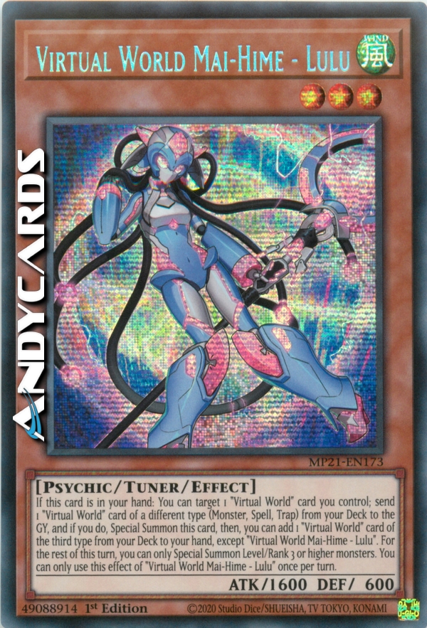 If this card is in your hand: You can target 1 "Virtual World" card you control; send 1 "Virtual World" card of a different type (Monster, Spell, Trap) from your Deck to the GY, and if you do, Special Summon this card, then, you can add 1 "Virtual World" card of the third type from your Deck to your hand, except "Virtual World Mai-Hime - Lulu". For the rest of this turn, you can only Special Summon Level/Rank 3 or higher monsters. You can only use this effect of "Virtual World Mai-Hime - Lulu" once per turn.
