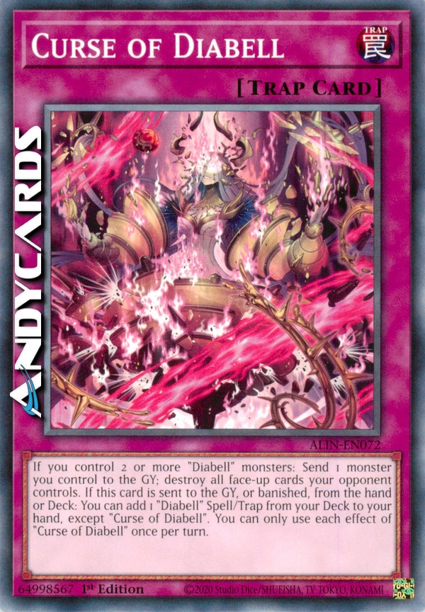 Se controlli 2 o più mostri "Diabell": manda 1 mostro che controlli al Cimitero; distruggi tutte le carte scoperte controllate dal tuo avversario. Se questa carta viene mandata al Cimitero, o bandita, dalla mano o Deck: puoi aggiungere 1 Magia/Trappola "Diabell" dal tuo Deck alla tua mano, eccetto "Maledizione di Diabell". Puoi utilizzare ogni effetto di "Maledizione di Diabell" una sola volta per turno.
