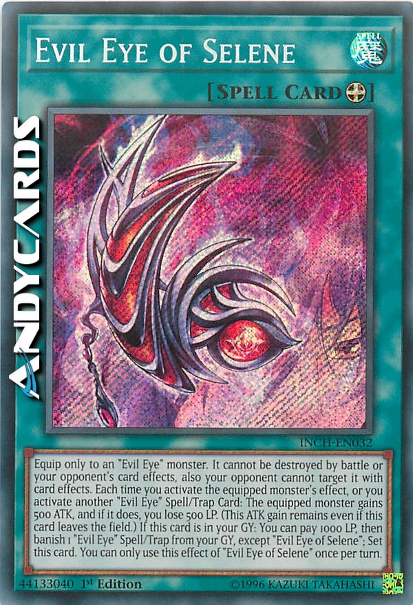 Equipaggia solo ad un mostro "Malocchio". Esso non può essere distrutto in battaglia o dagli effetti delle carte del tuo avversario, inoltre il tuo avversario non può sceglierlo come bersaglio con gli effetti delle carte. Ogni volta attivi l'effetto del mostro equipaggiato, o tu attivi un'altra Carta Magia/Trappola "Malocchio": il mostro equipaggiato guadagna 500 ATK e, se lo fa, tu perdi 500 LP. (Questo aumento di ATK rimane anche se questa carta lascia il Terreno.) Se questa carta è nel tuo Cimitero: puoi pagare 1000 LP, poi bandire 1 Magia/Trappola "Malocchio" dal tuo Cimitero, eccetto "Malocchio di Selene"; Posiziona questa carta. Puoi utilizzare questo effetto di "Malocchio di Selene" una sola volta per turno.