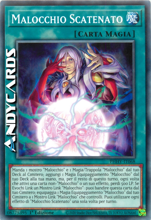 Manda 1 mostro "Malocchio" e 1 Magia/Trappola "Malocchio" dal tuo Deck al Cimitero; aggiungi 1 Magia Equipaggiamento "Malocchio" dal tuo Deck alla tua mano, ma, per il resto di questo turno, ogni volta che attivi una carta non-"Malocchio" o un suo effetto, perdi 500 LP. Se Evochi Link un Mostro Link "Malocchio": puoi bandire questa carta dal tuo Cimitero; equipaggia 1 Magia Equipaggiamento "Malocchio" dal tuo Cimitero a 1 Mostro Link "Malocchio" che controlli. Puoi utilizzare ogni effetto di "Malocchio Scatenato" una sola volta per turno.