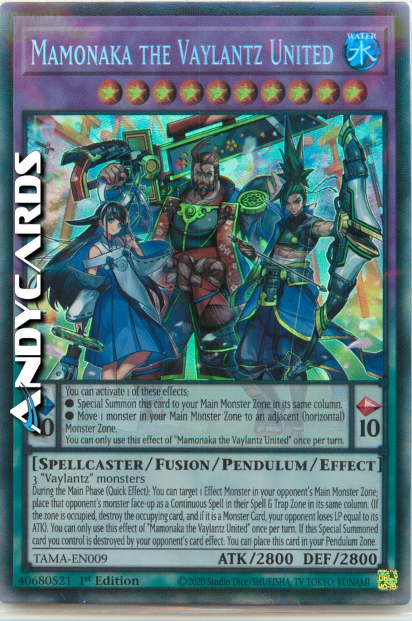 Durante la Main Phase (Effetto Rapido): puoi scegliere come bersaglio 1 Mostro con Effetto nella Zona Mostri Main del tuo avversario; metti quel mostro dell'avversario scoperto come una Magia Continua nella sua Zona Magie & Trappole nella sua stessa colonna. (Se la zona è occupata, distruggi la carta che la occupa e, se è una Carta Mostro, il tuo avversario perde LP pari al suo ATK). Puoi utilizzare questo effetto di "Mamonaka i Vaylantz Uniti" una sola volta per turno. Se questa carta Evocata Specialmente che controlli viene distrutta dall'effetto di una carta del tuo avversario: puoi mettere questa carta nella tua Zona Pendulum.