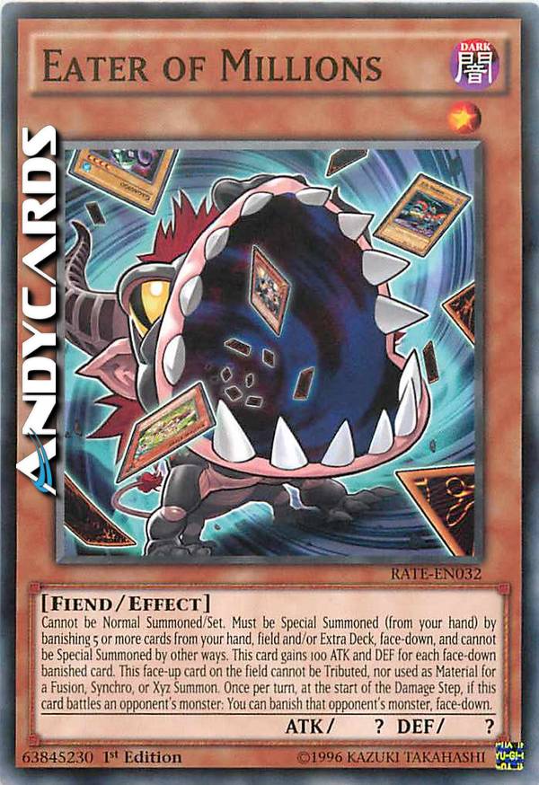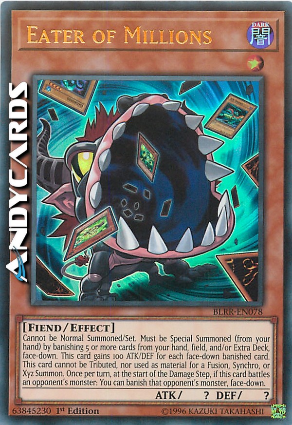 Non può essere Evocato Normalmente/Posizionato. Deve essere Evocato Specialmente (dalla tua mano) bandendo 5 o più carte dalla tua mano, Terreno e/o Extra Deck, coperte, e non può essere Evocato Specialmente in altri modi. Questa carta guadagna 100 ATK e DEF per ogni carta bandita coperta. Questa carta scoperta sul Terreno non può essere offerta come Tributo, né utilizzata come Materiale per un'Evocazione tramite Fusione, Synchro o Xyz. Una volta per turno, all'inizio del Damage Step, se questa carta combatte con un mostro dell'avversario: puoi bandire quel mostro dell'avversario, coperto.