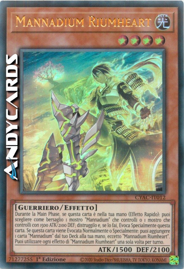 During the Main Phase, if this card is in your hand (Quick Effect): You can target 1 "Mannadium" monster you control or 1 monster you control with 1500 ATK/2100 DEF; destroy it, and if you do, Special Summon this card. If this card is Normal or Special Summoned: You can add 1 "Mannadium" card from your Deck to your hand, except "Mannadium Riumheart". You can only use each effect of "Mannadium Riumheart" once per turn.