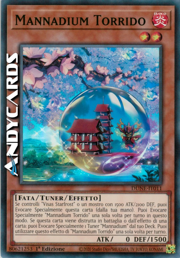 Se controlli "Visas Starfrost" o un mostro con 1500 ATK/2100 DEF, puoi Evocare Specialmente questa carta (dalla tua mano). Puoi Evocare Specialmente "Mannadium Torrido" una sola volta per turno in questo modo. Se questa carta viene distrutta in battaglia o dall'effetto di una carta: puoi Evocare Specialmente 1 Tuner "Mannadium" dal tuo Deck. Puoi utilizzare questo effetto di "Mannadium Torrido" una sola volta per turno.