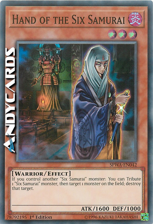 Se controlli un altro mostro "Sei Samurai" scoperto: puoi offrire come Tributo 1 mostro "Sei Samurai" per scegliere come bersaglio 1 mostro sul Terreno; distruggi quel bersaglio.