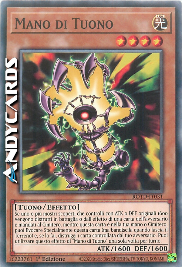 Se uno o più mostri scoperti che controlli con ATK o DEF originali 1600 vengono distrutti in battaglia o dall'effetto di una carta dell'avversario e mandati al Cimitero, mentre questa carta è nella tua mano o Cimitero: puoi Evocare Specialmente questa carta (ma bandiscila quando lascia il Terreno) e, se lo fai, distruggi 1 carta controllata dal tuo avversario. Puoi utilizzare questo effetto di "Mano di Tuono" una sola volta per turno.