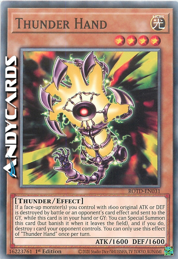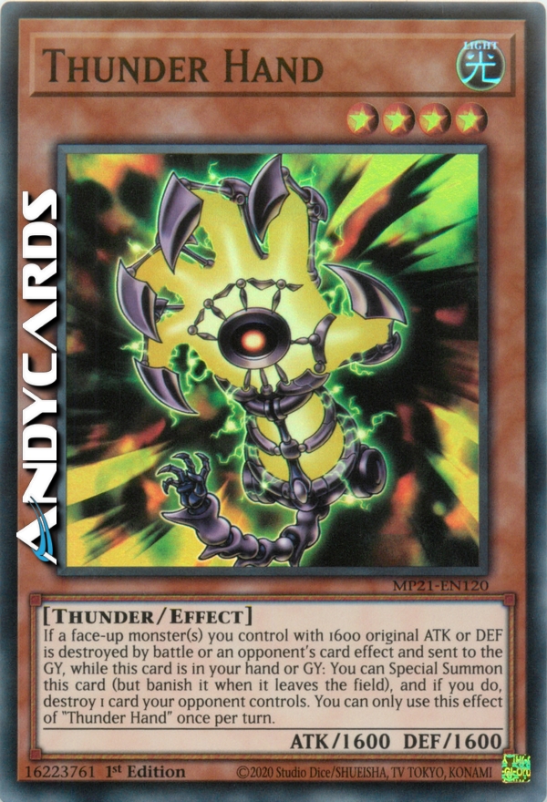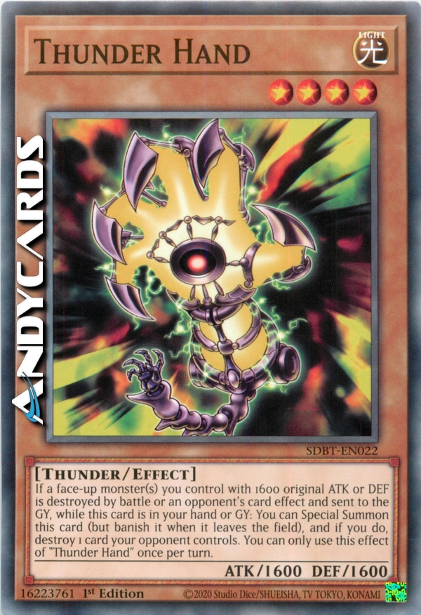 If a face-up monster(s) you control with 1600 original ATK or DEF is destroyed by battle or an opponent's card effect and sent to the GY, while this card is in your hand or GY: You can Special Summon this card (but banish it when it leaves the field), and if you do, destroy 1 card your opponent controls. You can only use this effect of "Thunder Hand" once per turn.