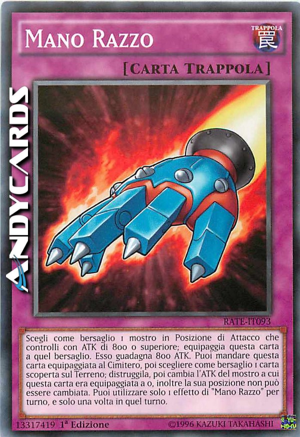 Scegli come bersaglio 1 mostro in Posizione di Attacco che controlli con ATK di 800 o superiore; equipaggia questa carta a quel bersaglio. Esso guadagna 800 ATK. Puoi mandare questa carta equipaggiata al Cimitero, poi scegliere come bersaglio 1 carta scoperta sul Terreno; distruggila, poi cambia l'ATK del mostro a cui questa carta era equipaggiata a 0, inoltre la sua posizione non può essere cambiata. Puoi utilizzare solo 1 effetto di "Mano Razzo" per turno, e solo una volta in quel turno.