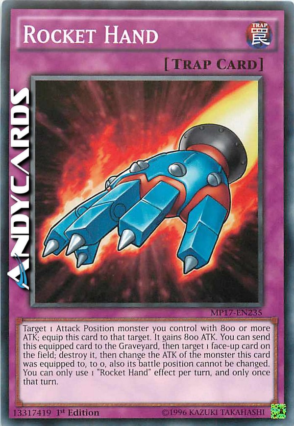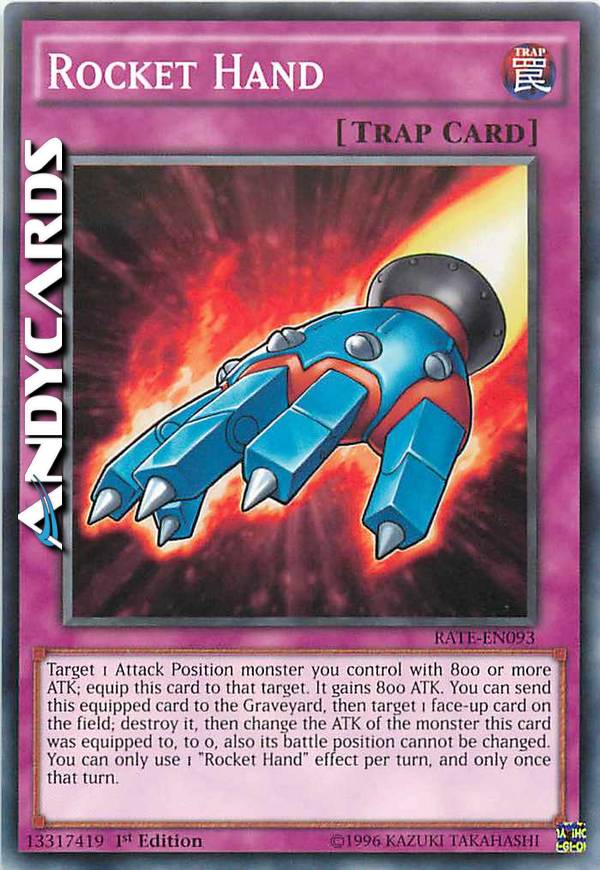 Target 1 face-up Attack Position monster you control with 800 or more ATK; equip this card to that target. It gains 800 ATK. You can send this equipped card to the Graveyard, then target 1 face-up card on the field; destroy it, then change the ATK of the monster this card was equipped to, to 0, also its battle position cannot be changed. You can only use 1 "Rocket Hand" effect per turn, and only once that turn.