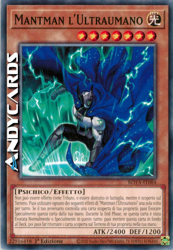 Non può essere offerto come Tributo, o essere distrutto in battaglia, mentre è scoperto sul Terreno. Puoi utilizzare ognuno dei seguenti effetti di "Mantman l'Ultraumano" una sola volta per turno. Se il tuo avversario controlla una carta scoperta di tua proprietà: puoi Evocare Specialmente questa carta dalla tua mano. Durante la End Phase, se questa carta è stata Evocata Normalmente o Specialmente in questo turno: puoi mettere questa carta in fondo al Deck, poi puoi far ritornare 1 carta scoperta sul Terreno di tua proprietà nella tua mano.