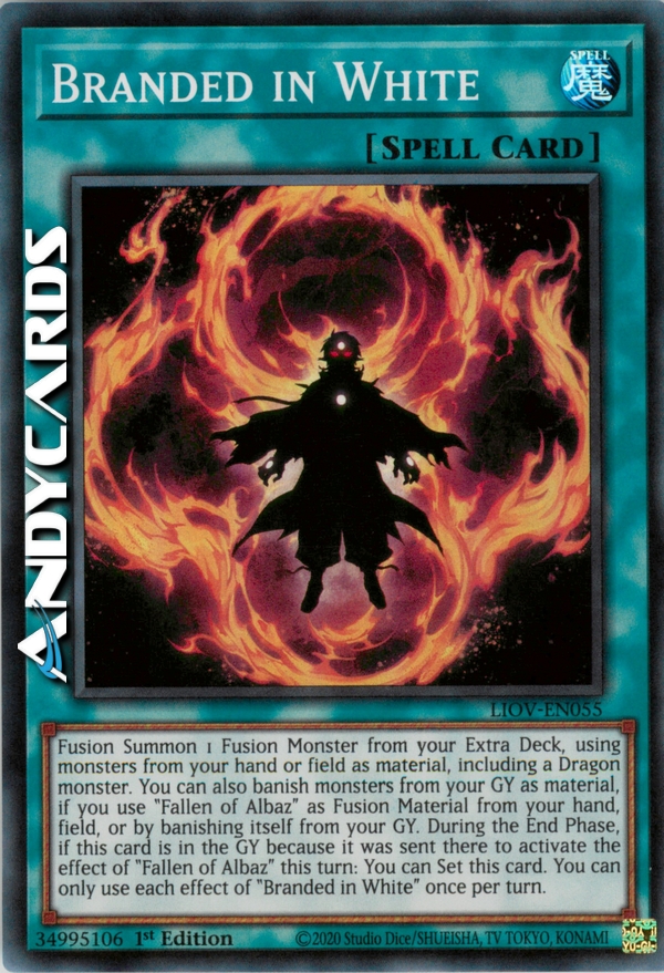 Fusion Summon 1 Fusion Monster from your Extra Deck, using monsters from your hand or field as material, including a Dragon monster. You can also banish monsters from your GY as material, if you use "Fallen of Albaz" as Fusion Material from your hand, field, or by banishing itself from your GY. During the End Phase, if this card is in the GY because it was sent there to activate the effect of "Fallen of Albaz" this turn: You can Set this card. You can only use each effect of "Branded in White" once per turn.