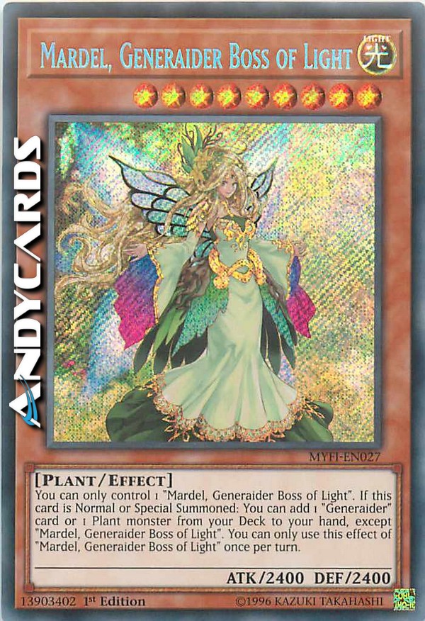 Puoi controllare solo 1 "Mardel, Boss Generaider della Luce". Se questa carta viene Evocata Normalmente o Specialmente: puoi aggiungere 1 carta "Generaider" o 1 mostro Pianta dal tuo Deck alla tua mano, eccetto "Mardel, Boss Generaider della Luce". Puoi utilizzare questo effetto di "Mardel, Boss Generaider della Luce" una sola volta per turno.