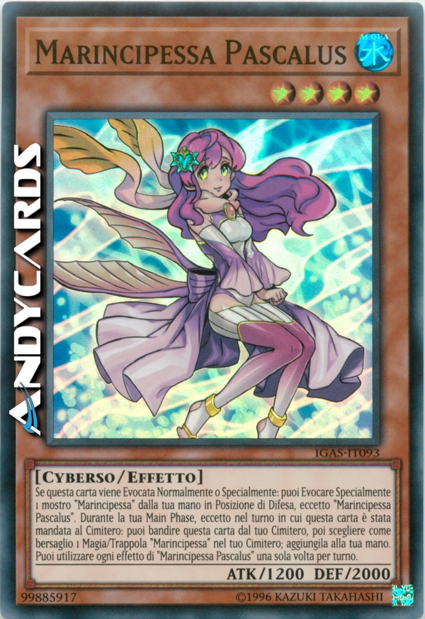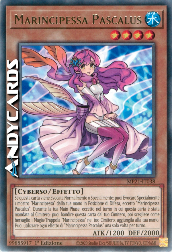 Se questa carta viene Evocata Normalmente o Specialmente: puoi Evocare Specialmente 1 mostro "Marincipessa" dalla tua mano in Posizione di Difesa, eccetto "Marincipessa Pascalus". Durante la tua Main Phase, eccetto nel turno in cui questa carta è stata mandata al Cimitero: puoi bandire questa carta dal tuo Cimitero, poi scegliere come bersaglio 1 Magia/Trappola "Marincipessa" nel tuo Cimitero; aggiungila alla tua mano. Puoi utilizzare ogni effetto di "Marincipessa Pascalus" una sola volta per turno.