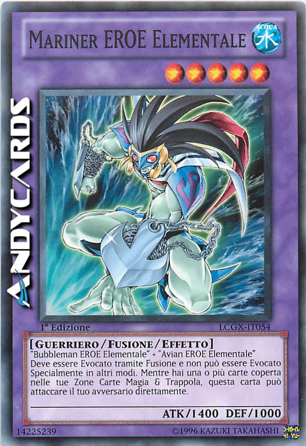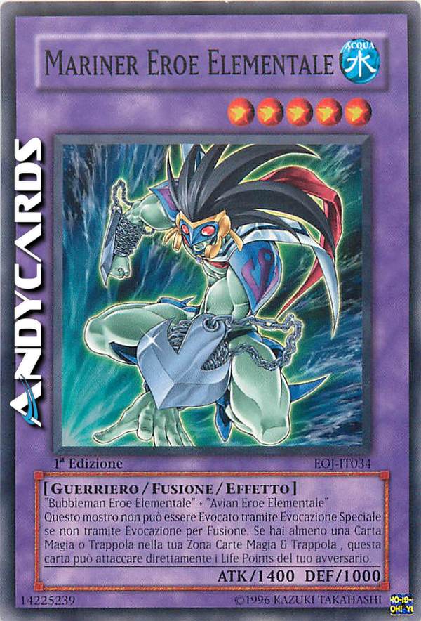 Bubbleman Eroe Elementale + "Avian Eroe Elementale". Questo mostro non può essere Evocato tramite Evocazione Speciale se non tramite Evocazione per Fusione. Se hai almeno una Carta Magia nella tua Zona Carte Magia & Trappola, questa carta può attaccare direttamente i Life Points del tuo avversario