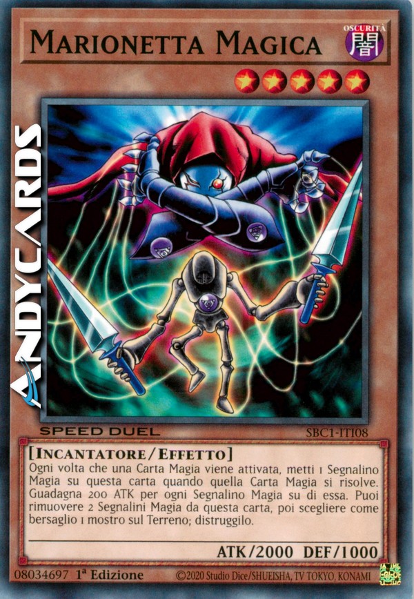 Ogni volta che una Carta Magia viene attivata, metti 1 Segnalino Magia su questa carta quando quella Carta Magia si risolve. Guadagna 200 ATK per ogni Segnalino Magia su di essa. Puoi rimuovere 2 Segnalini Magia da questa carta, poi scegliere come bersaglio 1 mostro sul Terreno; distruggilo.