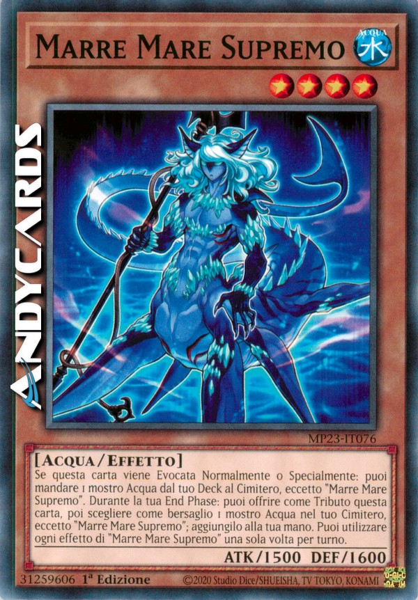 Se questa carta viene Evocata Normalmente o Specialmente: puoi mandare 1 mostro Acqua dal tuo Deck al Cimitero, eccetto "Marre Mare Supremo". Durante la tua End Phase: puoi offrire come Tributo questa carta, poi scegliere come bersaglio 1 mostro Acqua nel tuo Cimitero, eccetto "Marre Mare Supremo"; aggiungilo alla tua mano. Puoi utilizzare ogni effetto di "Marre Mare Supremo" una sola volta per turno.