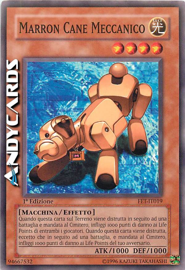 Quando questa carta sul Terreno viene distrutta in seguito ad una battaglia e mandata al Cimitero, infliggi 1000 punti di danno ai Life Points di entrambi i giocatori. Quando questa carta viene distrutta, eccetto che in seguito ad una battaglia, e mandata al Cimitero, infliggi 1000 punti di danno ai Life Points del tuo avversario.