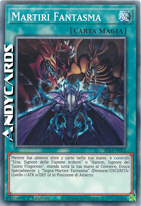 Puoi attivare questa carta fino a quando hai 2 o più carte in mano e hai "Uria, Signore delle Fiamme Ardenti" o "Hamon, Signore del Tuono Fragoroso" scoperto sul tuo Terreno. Manda tutta la tua mano al Cimitero per Evocare tramite Evocazione Speciale 3 "Segna-Martire Fantasma" (Tipo-Demone/OSCURITA'/Livello 1/ATK 0/DEF 0) in Posizione d'Attacco sul tuo Terreno.