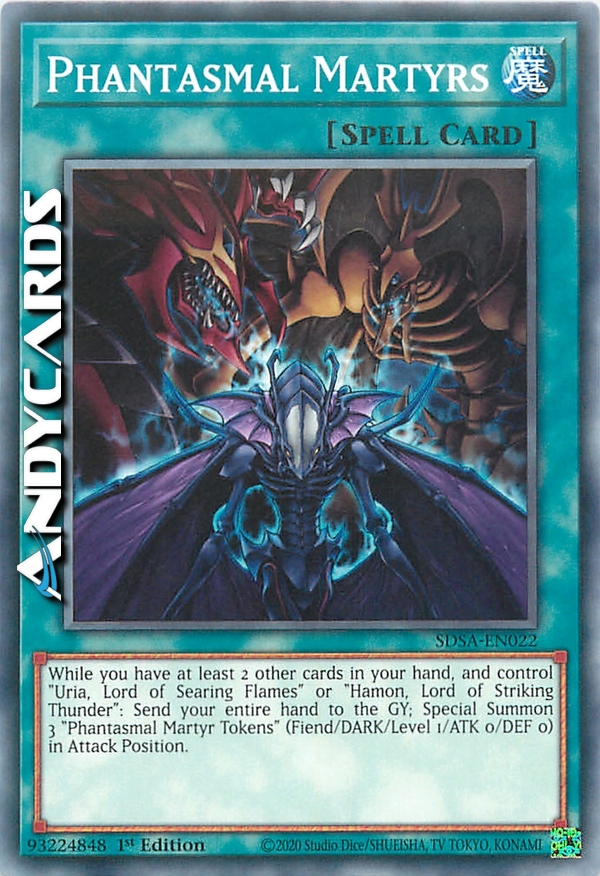 You can only activate this card while you have 2 or more cards in your hand, and have either "Uria, Lord of Searing Flames" or "Hamon, Lord of Striking Thunder" face-up on your side of the field. By sending your entire hand to the Graveyard, Special Summon 3 "Phantasmal Martyr Tokens" (Fiend-Type/DARK/Level 1/0/0) in Attack Position on your side of the field.