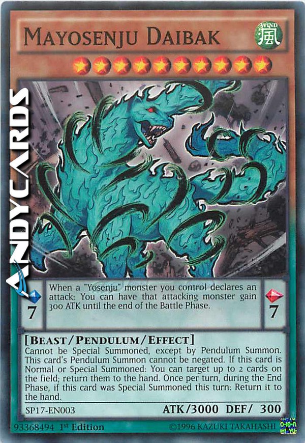 Quando un mostro "Yosenju" che controlli dichiara un attacco: puoi far guadagnare 300 ATK a quel mostro attaccante fino alla fine della Battle Phase. Non può essere Evocato Specialmente, eccetto tramite Evocazione Pendulum. L'Evocazione Pendulum di questa carta non può essere annullata. Se questa carta viene Evocata Normalmente o Specialmente: puoi scegliere come bersaglio fino a 2 carte sul Terreno; falle ritornare nella mano. Una volta per turno, durante la End Phase, se questa carta è stata Evocata Specialmente in questo turno: falla ritornare nella mano.