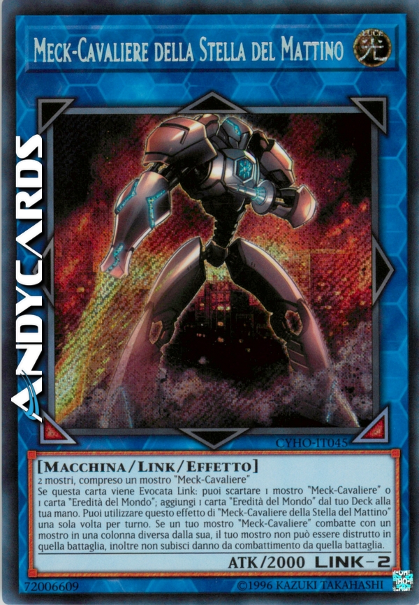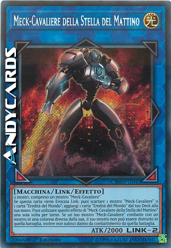 Se questa carta viene Evocata Link: puoi scartare 1 mostro "Meck-Cavaliere" o 1 carta "Eredità del Mondo"; aggiungi 1 carta "Eredità del Mondo" dal tuo Deck alla tua mano. Puoi utilizzare questo effetto di "Meck-Cavaliere della Stella del Mattino" una sola volta per turno. Se un tuo mostro "Meck-Cavaliere" combatte con un mostro in una colonna diversa dalla sua, il tuo mostro non può essere distrutto in quella battaglia, inoltre non subisci danno da combattimento da quella battaglia.