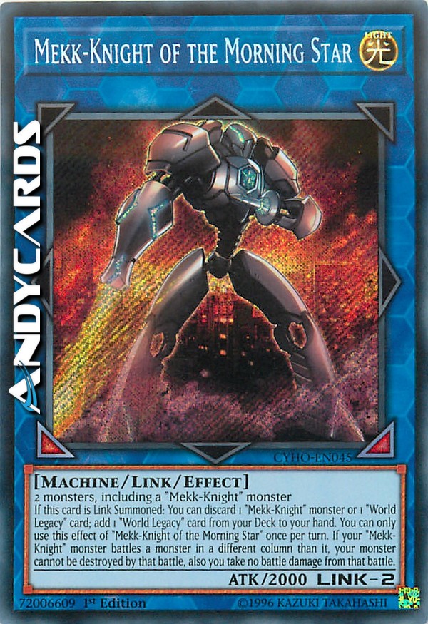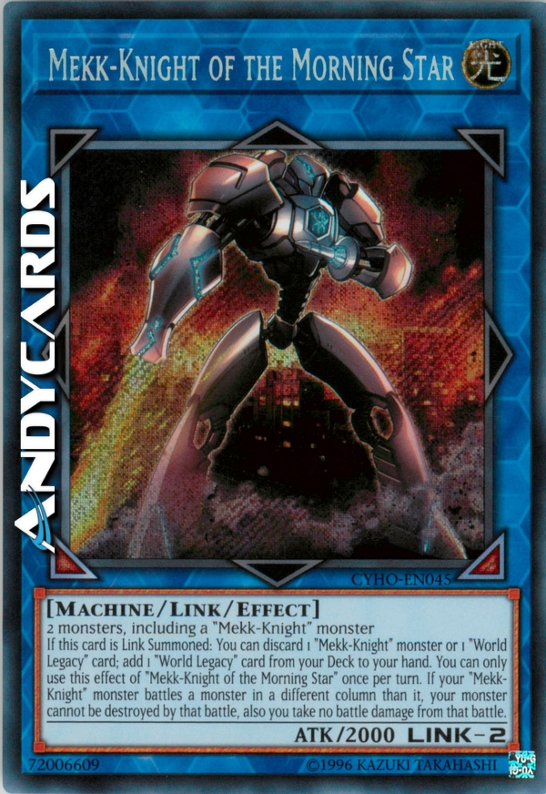 If this card is Link Summoned: You can discard 1 "Mekk-Knight" monster or 1 "World Legacy" card; add 1 "World Legacy" card from your Deck to your hand. You can only use this effect of "Mekk-Knight of the Morning Star" once per turn. If your "Mekk-Knight" monster battles a monster in a different column than it, your monster cannot be destroyed by that battle, also you take no battle damage from that battle.