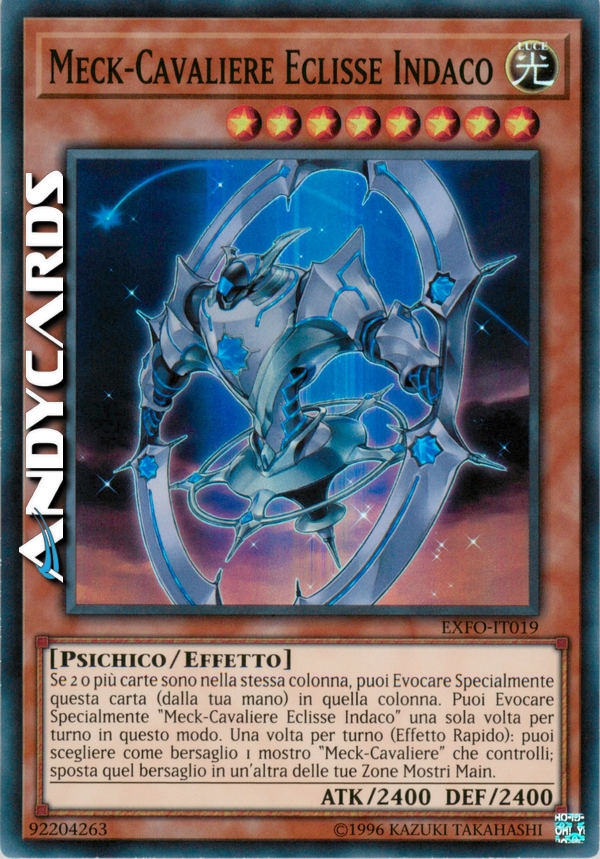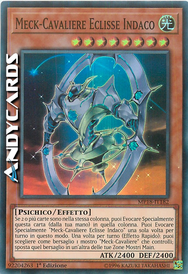 Se 2 o più carte sono nella stessa colonna, puoi Evocare Specialmente questa carta (dalla tua mano) in quella colonna. Puoi Evocare Specialmente "Meck-Cavaliere Eclisse Indaco" una sola volta per turno in questo modo. Una volta per turno (Effetto Rapido): puoi scegliere come bersaglio 1 mostro "Meck-Cavaliere" che controlli; sposta quel bersaglio in un'altra delle tue Zone Mostri Main.