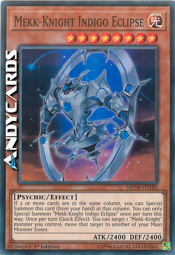 If 2 or more cards are in the same column, you can Special Summon this card (from your hand) in that column. You can only Special Summon "Mekk-Knight Indigo Eclipse" once per turn this way. Once per turn (Quick Effect): You can target 1 "Mekk-Knight" monster you control; move that target to another of your Main Monster Zones.