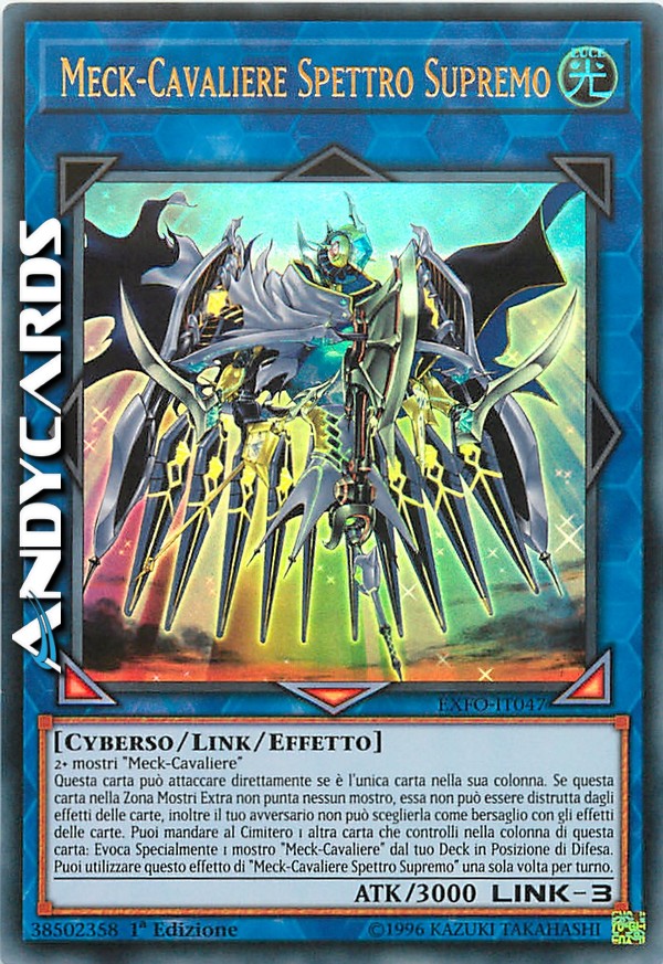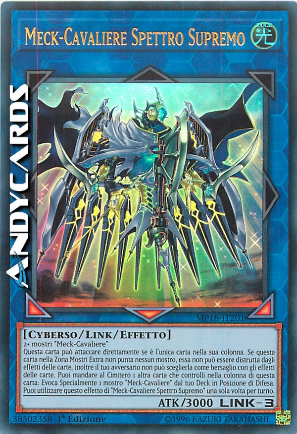 Questa carta può attaccare direttamente se è l'unica carta nella sua colonna. Se questa carta nella Zona Mostri Extra non punta nessun mostro, essa non può essere distrutta dagli effetti delle carte, inoltre il tuo avversario non può sceglierla come bersaglio con gli effetti delle carte. Puoi mandare al Cimitero 1 altra carta che controlli nella colonna di questa carta: Evoca Specialmente 1 mostro "Meck-Cavaliere" dal tuo Deck in Posizione di Difesa. Puoi utilizzare questo effetto di "Meck-Cavaliere Spettro Supremo" una sola volta per turno.