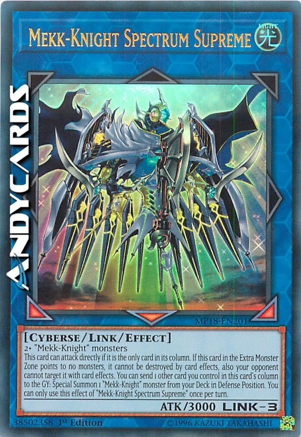 This card can attack directly if it is the only card in its column. If this card in the Extra Monster Zone points to no monsters, it cannot be destroyed by card effects, also your opponent cannot target it with card effects. You can send 1 other card you control in this card's column to the GY; Special Summon 1 "Mekk-Knight" monster from your Deck in Defense Position. You can only use this effect of "Mekk-Knight Spectrum Supreme" once per turn.