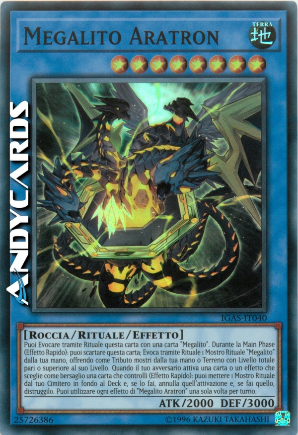 Puoi Evocare tramite Rituale questa carta con una carta "Megalito". Durante la Main Phase (Effetto Rapido): puoi scartare questa carta; Evoca tramite Rituale 1 Mostro Rituale "Megalito" dalla tua mano, offrendo come Tributo mostri dalla tua mano o Terreno con Livello totale pari o superiore al suo Livello. Quando il tuo avversario attiva una carta o un effetto che sceglie come bersaglio una carta che controlli (Effetto Rapido): puoi mettere 1 Mostro Rituale dal tuo Cimitero in fondo al Deck e, se lo fai, annulla quell'attivazione e, se fai quello, distruggilo. Puoi utilizzare ogni effetto di "Megalito Aratron" una sola volta per turno.