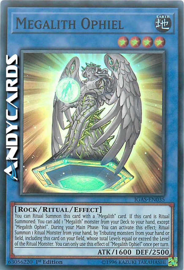Puoi Evocare tramite Rituale questa carta con una carta "Megalito". Se questa carta viene Evocata tramite Rituale: puoi aggiungere 1 mostro "Megalito" dal tuo Deck alla tua mano, eccetto "Megalito Ophiel". Durante la tua Main Phase: puoi attivare questo effetto; Evoca tramite Rituale 1 Mostro Rituale dalla tua mano, offrendo come Tributo mostri dalla tua mano o Terreno, compresa questa carta sul tuo Terreno, con Livello totale pari o superiore al Livello del Mostro Rituale. Puoi utilizzare questo effetto di "Megalito Ophiel" una sola volta per turno.