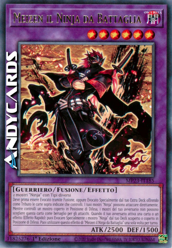 Deve prima essere Evocato tramite Fusione, oppure Evocato Specialmente dal tuo Extra Deck offrendo come Tributo le carte sopra indicate che controlli. I tuoi mostri "Ninja" possono attaccare direttamente. Mentre controlli un mostro coperto in Posizione di Difesa, i mostri del tuo avversario non possono scegliere questa carta come bersaglio per gli attacchi. Quando il tuo avversario attiva una carta o un effetto (Effetto Rapido): puoi Evocare Specialmente 1 mostro "Ninja" dal tuo Deck scoperto o coperto in Posizione di Difesa. Puoi utilizzare questo effetto di "Meizen il Ninja da Battaglia" una sola volta per turno.