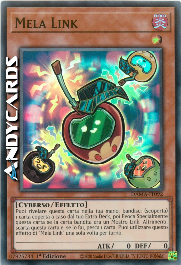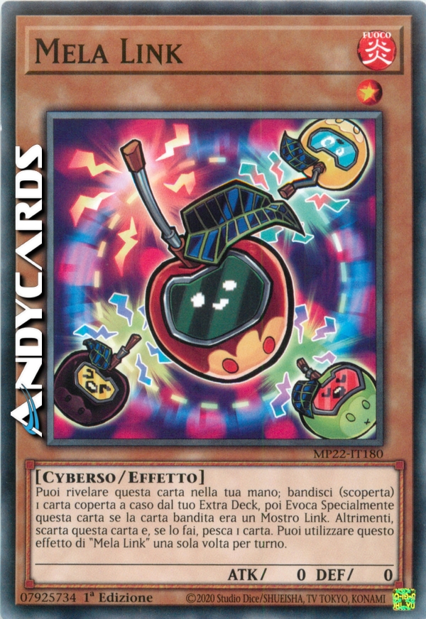 Puoi rivelare questa carta nella tua mano; bandisci (scoperta) 1 carta coperta a caso dal tuo Extra Deck, poi Evoca Specialmente questa carta se la carta bandita era un Mostro Link. Altrimenti, scarta questa carta e, se lo fai, pesca 1 carta. Puoi utilizzare questo effetto di "Mela Link" una sola volta per turno.