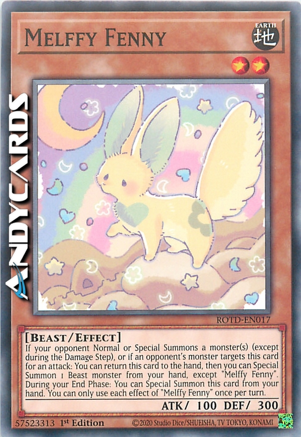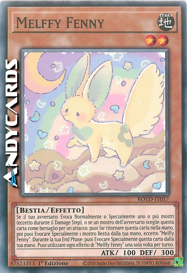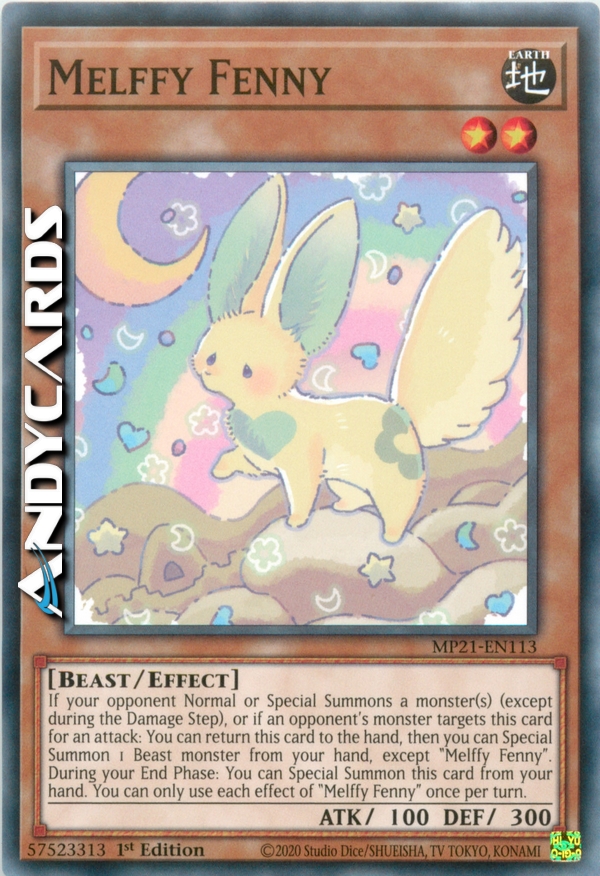 Se il tuo avversario Evoca Normalmente o Specialmente uno o più mostri (eccetto durante il Damage Step), o se un mostro dell'avversario sceglie questa carta come bersaglio per un attacco: puoi far ritornare questa carta nella mano, poi puoi Evocare Specialmente 1 mostro Bestia dalla tua mano, eccetto "Melffy Fenny". Durante la tua End Phase: puoi Evocare Specialmente questa carta dalla tua mano. Puoi utilizzare ogni effetto di "Melffy Fenny" una sola volta per turno.