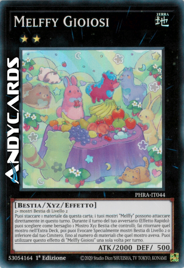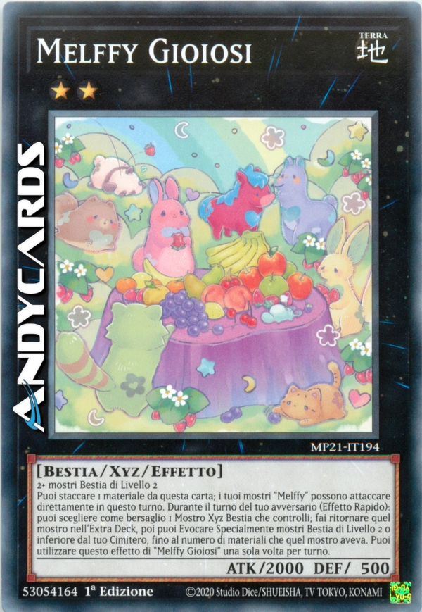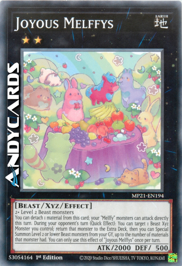 Puoi staccare 1 materiale da questa carta; i tuoi mostri "Melffy" possono attaccare direttamente in questo turno. Durante il turno del tuo avversario (Effetto Rapido): puoi scegliere come bersaglio 1 Mostro Xyz Bestia che controlli; fai ritornare quel mostro nell'Extra Deck, poi puoi Evocare Specialmente mostri Bestia di Livello 2 o inferiore dal tuo Cimitero, fino al numero di materiali che quel mostro aveva. Puoi utilizzare questo effetto di "Melffy Gioiosi" una sola volta per turno.