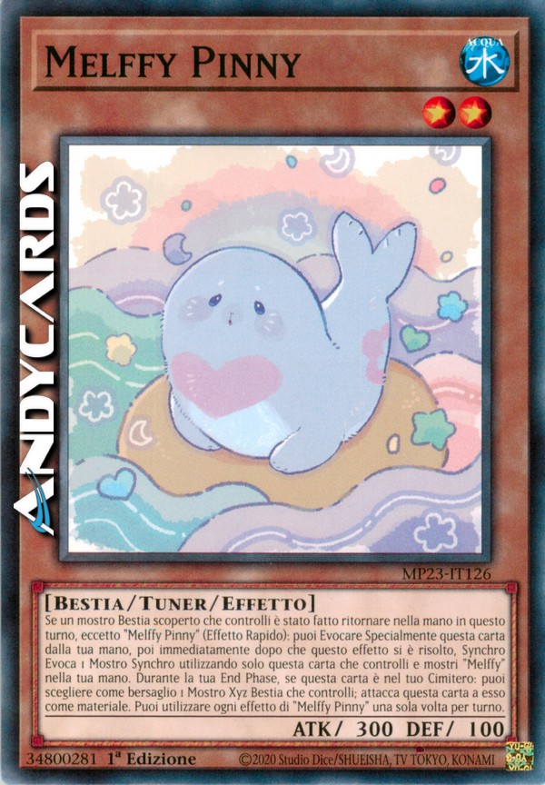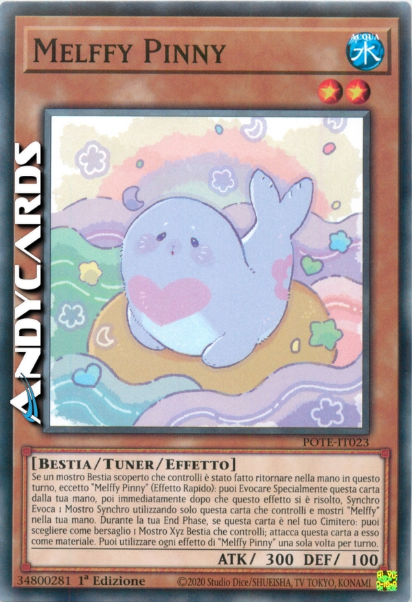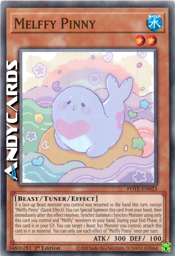 Se un mostro Bestia scoperto che controlli è stato fatto ritornare nella mano in questo turno, eccetto "Melffy Pinny" (Effetto Rapido): puoi Evocare Specialmente questa carta dalla tua mano, poi immediatamente dopo che questo effetto si è risolto, Synchro Evoca 1 Mostro Synchro utilizzando solo questa carta che controlli e mostri "Melffy" nella tua mano. Durante la tua End Phase, se questa carta è nel tuo Cimitero: puoi scegliere come bersaglio 1 Mostro Xyz Bestia che controlli; attacca questa carta a esso come materiale. Puoi utilizzare ogni effetto di "Melffy Pinny" una sola volta per turno.