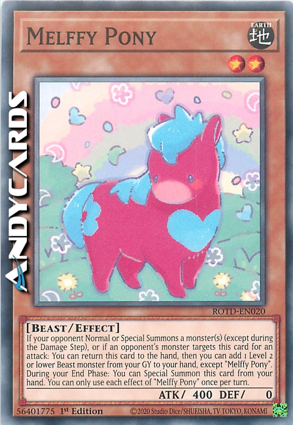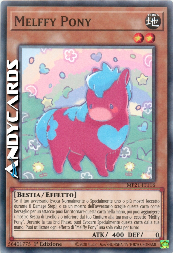 Se il tuo avversario Evoca Normalmente o Specialmente uno o più mostri (eccetto durante il Damage Step), o se un mostro dell'avversario sceglie questa carta come bersaglio per un attacco: puoi far ritornare questa carta nella mano, poi puoi aggiungere 1 mostro Bestia di Livello 2 o inferiore dal tuo Cimitero alla tua mano, eccetto "Melffy Pony". Durante la tua End Phase: puoi Evocare Specialmente questa carta dalla tua mano. Puoi utilizzare ogni effetto di "Melffy Pony" una sola volta per turno.