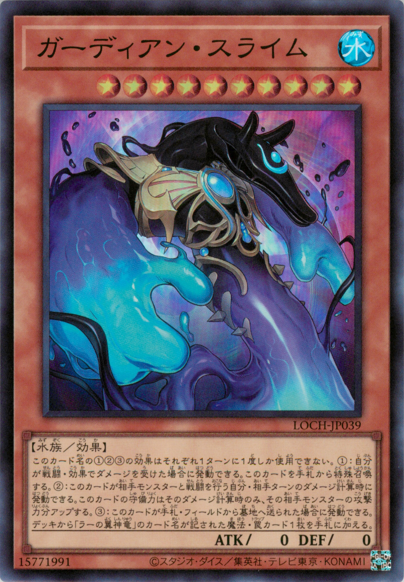 If you take battle or effect damage: You can Special Summon this card from your hand. During damage calculation, if this card battles an opponent's monster (Quick Effect): You can make this card gain DEF equal to that opponent's monster's ATK during that damage calculation only. If this card is sent from the hand or field to the GY: You can add 1 Spell/Trap from your Deck to your hand that specifically lists the card "The Winged Dragon of Ra" in its text. You can only use each effect of "Guardian Slime" once per turn.