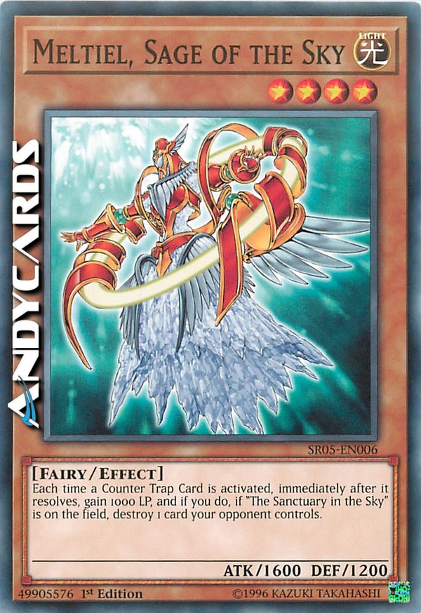 Ogni volta che una Carta Contro-Trappola viene attivata, guadagni 1000 Life Point, e se "Il Santuario nel Cielo" è scoperto sul Terreno, distruggi 1 carta controllata dal tuo avversario.