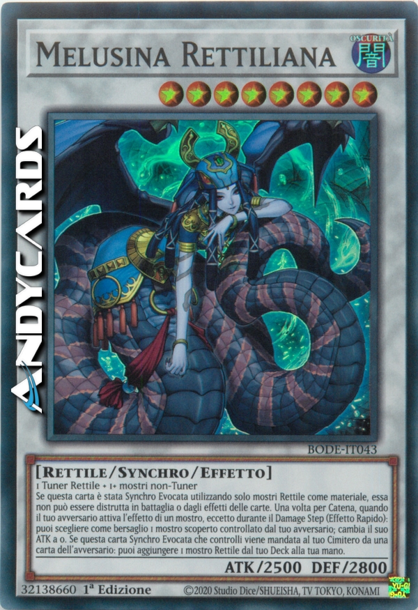 Se questa carta è stata Synchro Evocata utilizzando solo mostri Rettile come materiale, essa non può essere distrutta in battaglia o dagli effetti delle carte. Una volta per Catena, quando il tuo avversario attiva l'effetto di un mostro, eccetto durante il Damage Step (Effetto Rapido): puoi scegliere come bersaglio 1 mostro scoperto controllato dal tuo avversario; cambia il suo ATK a 0. Se questa carta Synchro Evocata che controlli viene mandata al tuo Cimitero da una carta dell'avversario: puoi aggiungere 1 mostro Rettile dal tuo Deck alla tua mano.